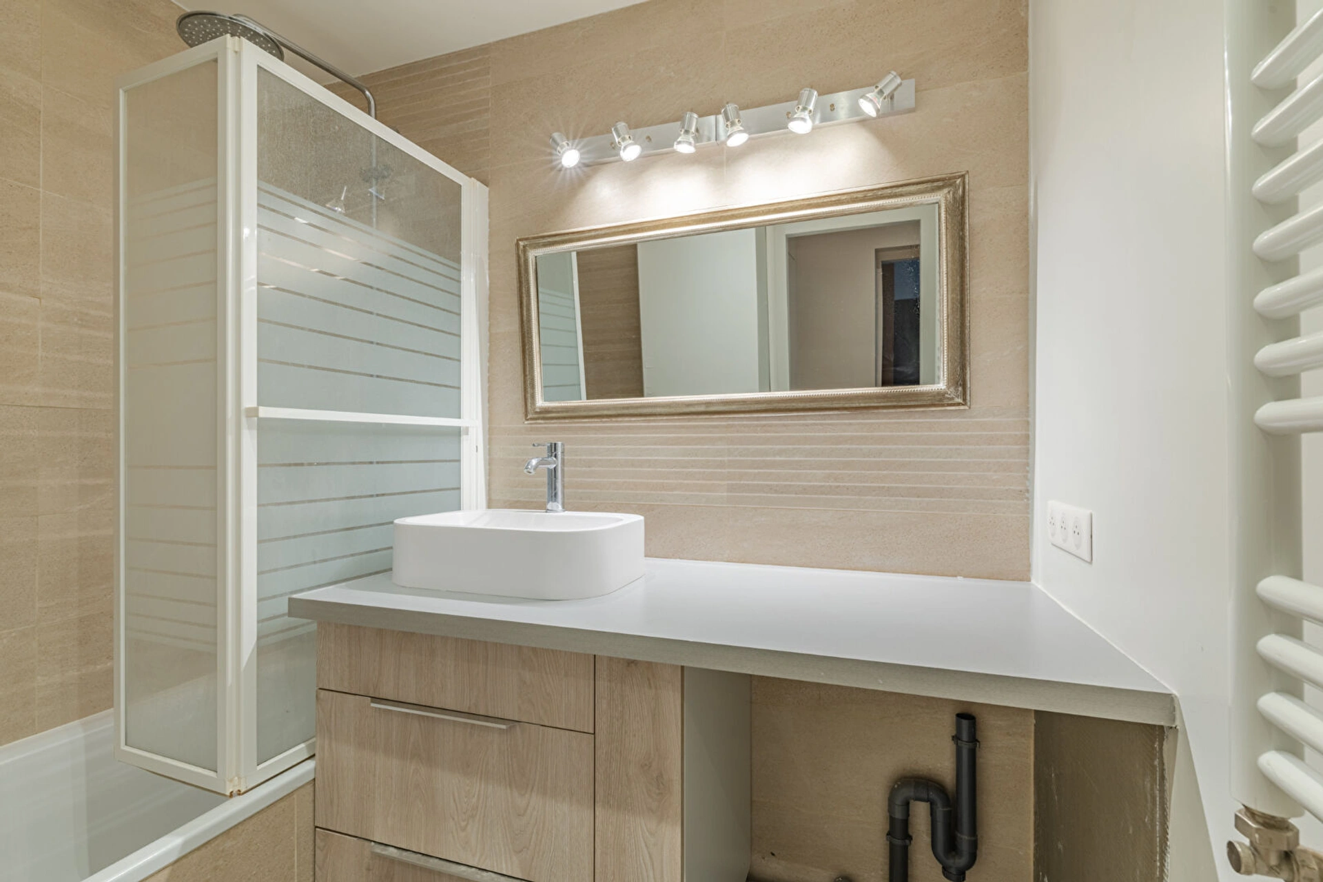 L'appartement se compose d'une entrée, rangements, un bel espace de vie avec cuisine US et un bar, une chambre de bonne taille, des WC séparés et une salle de bain.