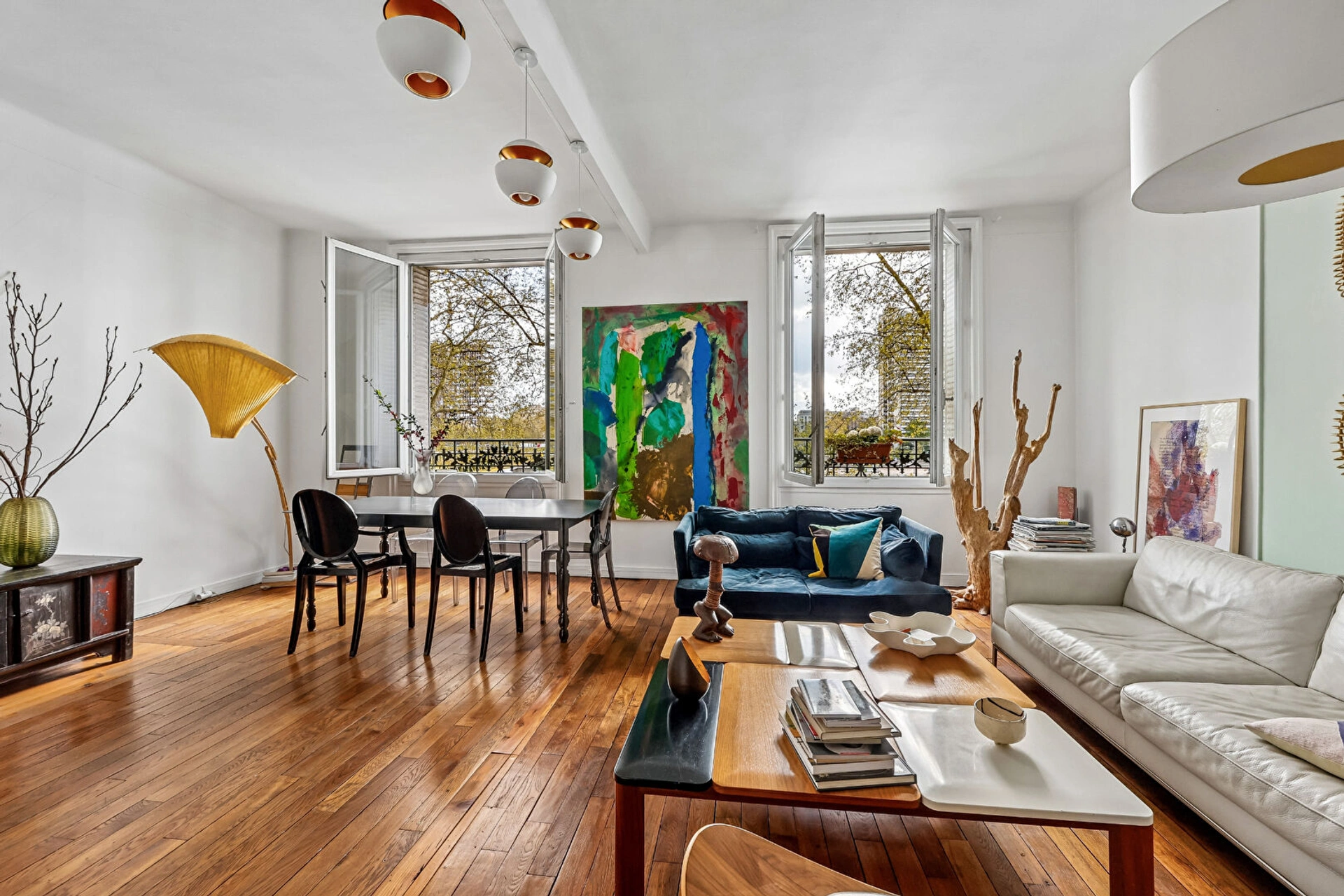 Un vaste double séjour / salle à manger avec une superbe vue plongeante sur la Seine.