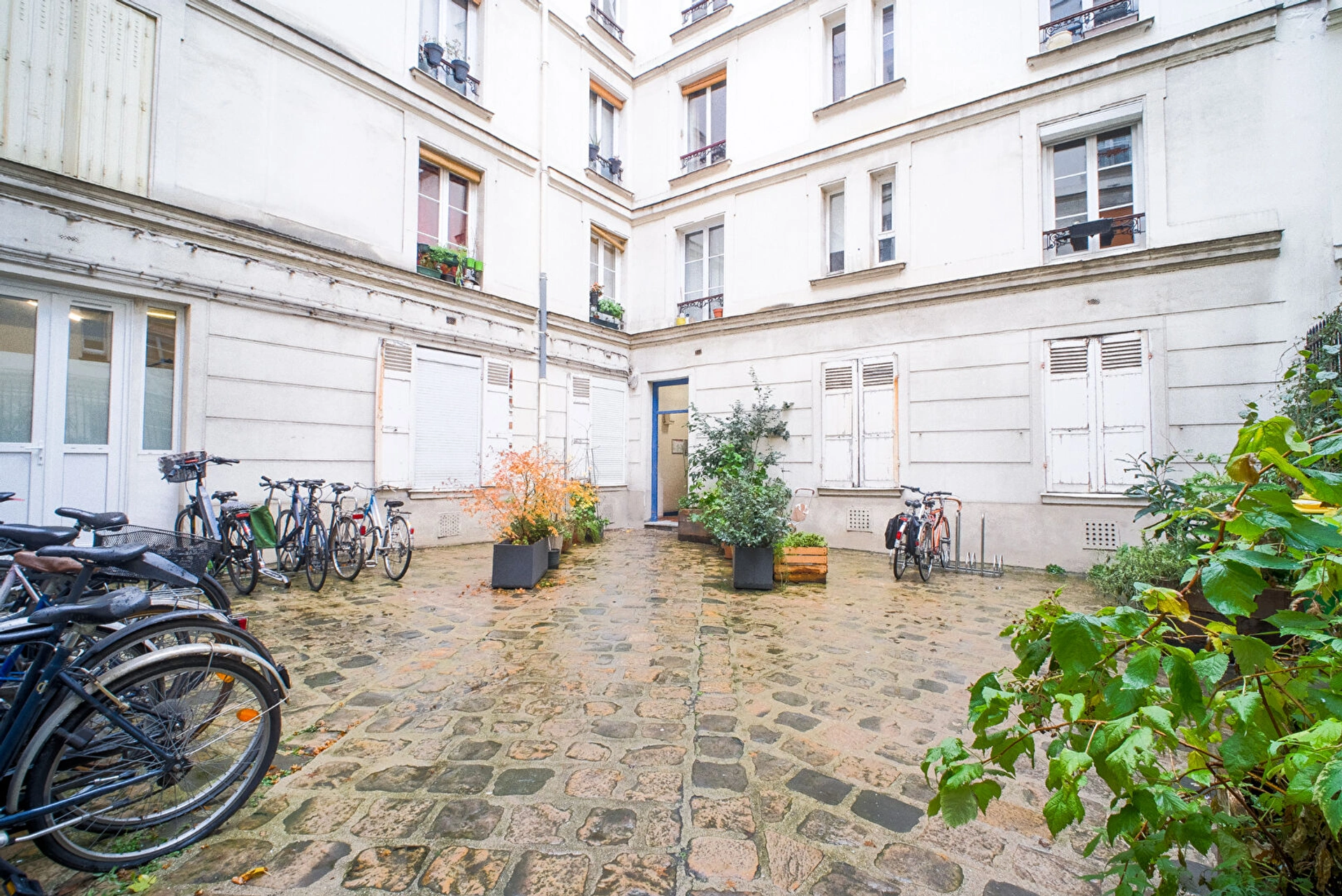 L'intégralité de l'appartement donne sur une grande cour au calme absolu. Il est en très bon état.