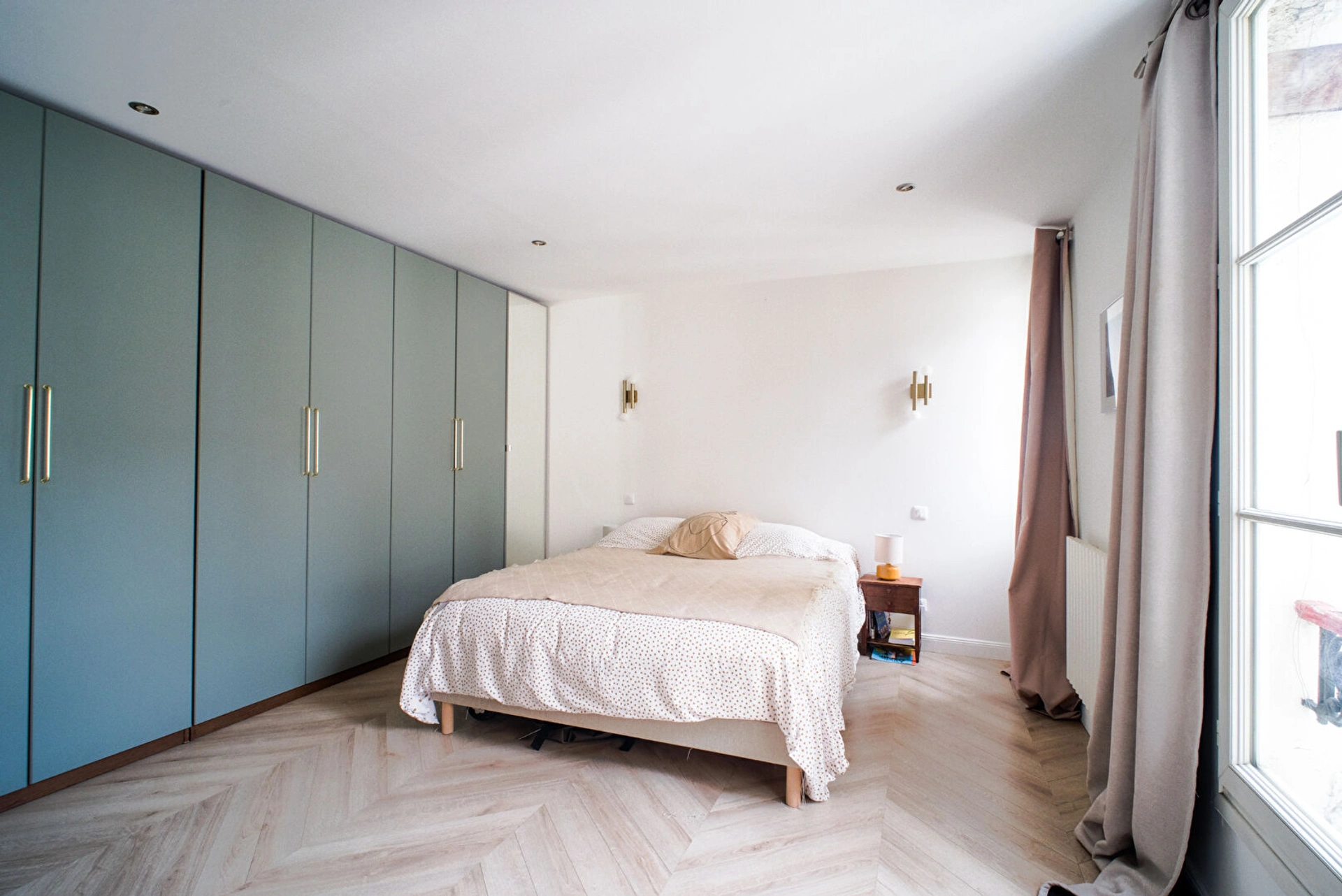 Ce logement est situé au 5ème étage sur 6 de l'immeuble. Il se compose de la manière suivante : une entrée avec rangements sur mesure, une salle de douche avec WC intégrés, lave-mains et fenêtre, une chambre à destination d'un coin nuit ou bureau, une magnifique pièce de vie lumineuse avec deux fenêtres et une grande cuisine sur-mesure ouverte équipée et aménagée et enfin une belle chambre avec rangements intégrés.